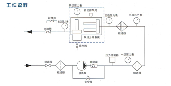 被過濾的油液在供油泵的負(fù)壓驅(qū)動(dòng)下首先通過粗濾器,攔大于60μm雜質(zhì),然后進(jìn)入到細(xì)濾器,大于20μm的雜質(zhì)被過濾掉,當(dāng)油液經(jīng)過精濾器時(shí),過濾精度可達(dá)到3μm。油液經(jīng)過3次過濾后,進(jìn)入到聚結(jié)分離罐進(jìn)行脫水處理。油液在聚結(jié)分離罐內(nèi)首先通過聚結(jié)元件,聚結(jié)元件有破乳和聚結(jié)兩種功能,在通過破乳層時(shí)破掉乳化油的乳化度,使之形成游離態(tài)的油和水,在通過聚結(jié)層時(shí),小顆粒的水聚結(jié)形成大顆粒的水,由于油、水存在比重差,因此聚結(jié)后的大顆粒水自然沉降在聚結(jié)分離罐底部的蓄水池內(nèi)。未及時(shí)沉降下來的水繼續(xù)隨油液前行,在通過分離元件時(shí),由于分離元件表層噴涂有高分子材料,對(duì)水有強(qiáng)大的排斥作用,因此可把水?dāng)r于分離元件之外,使之不能通過分離元件,水自然沉降到蓄水池內(nèi),從分離元件流出的油就是凈油,這就完成了對(duì)油凈化的過程。